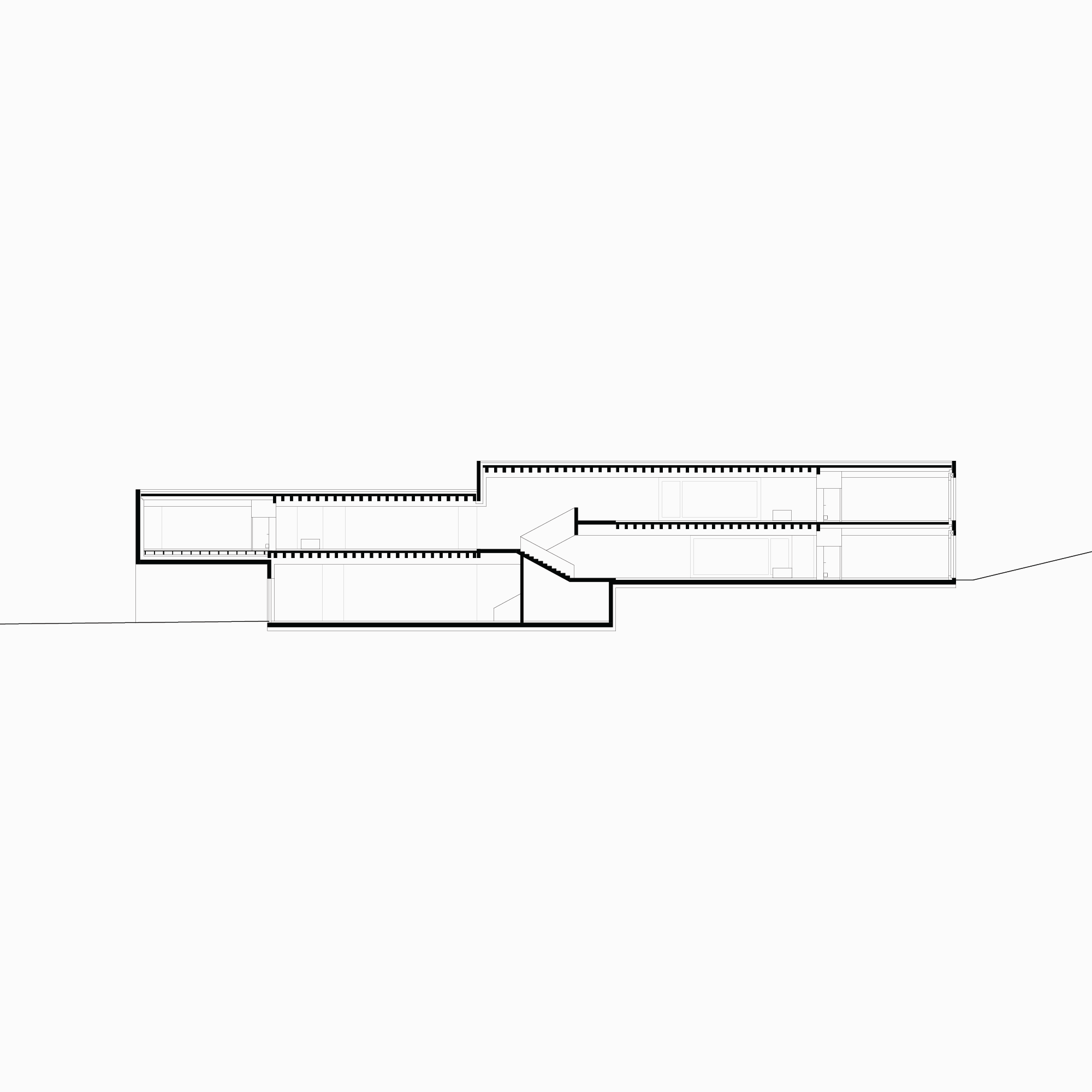 Die beiden Bauten dieses Gebäudes wurden an einem gleichmässig verlaufenden Gefälle des vorhandenen Baugrundes errichtet. Ihre geringe Höhe sowie ihre horizontal und vertikal versetzte Lage verleihen dem Objekt einen soliden und Ruhe ausstrahlenden Charakter und eine angemessene Dimension. Dies spiegelt sich auch in der Komposition der Fassaden wider, die abwechselnd hellgraue Farbtöne und grosse Öffnungen aufweisen. Die reduzierte Anzahl der Fenster sowie deren Grösse und Lage untermauern den sanften und beruhigenden Gesamteindruck der Primarschule und des Kindergartens.