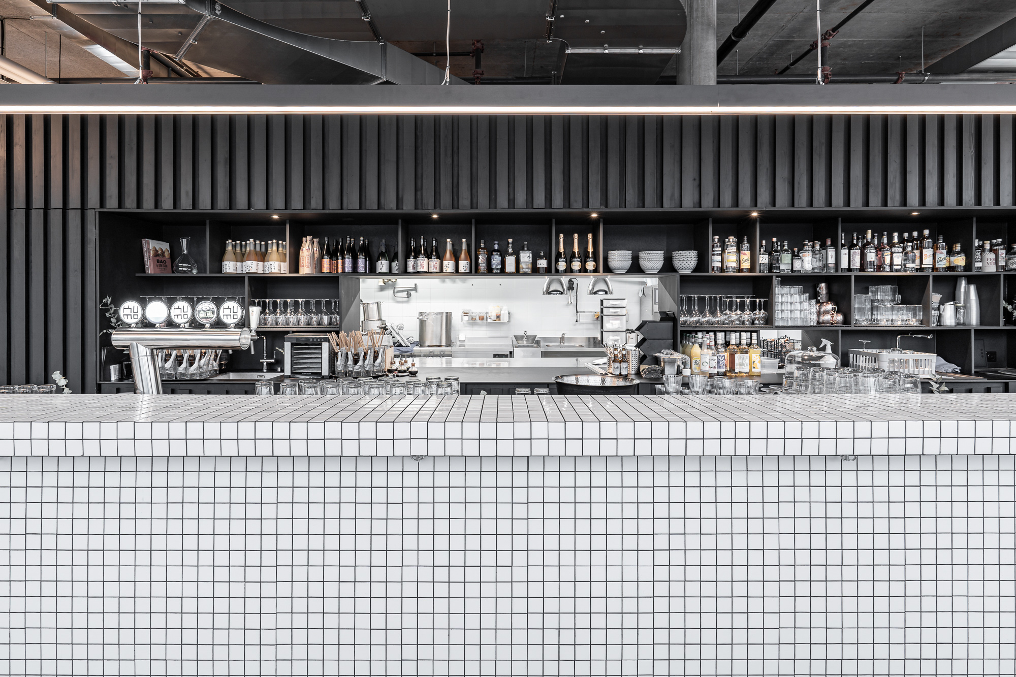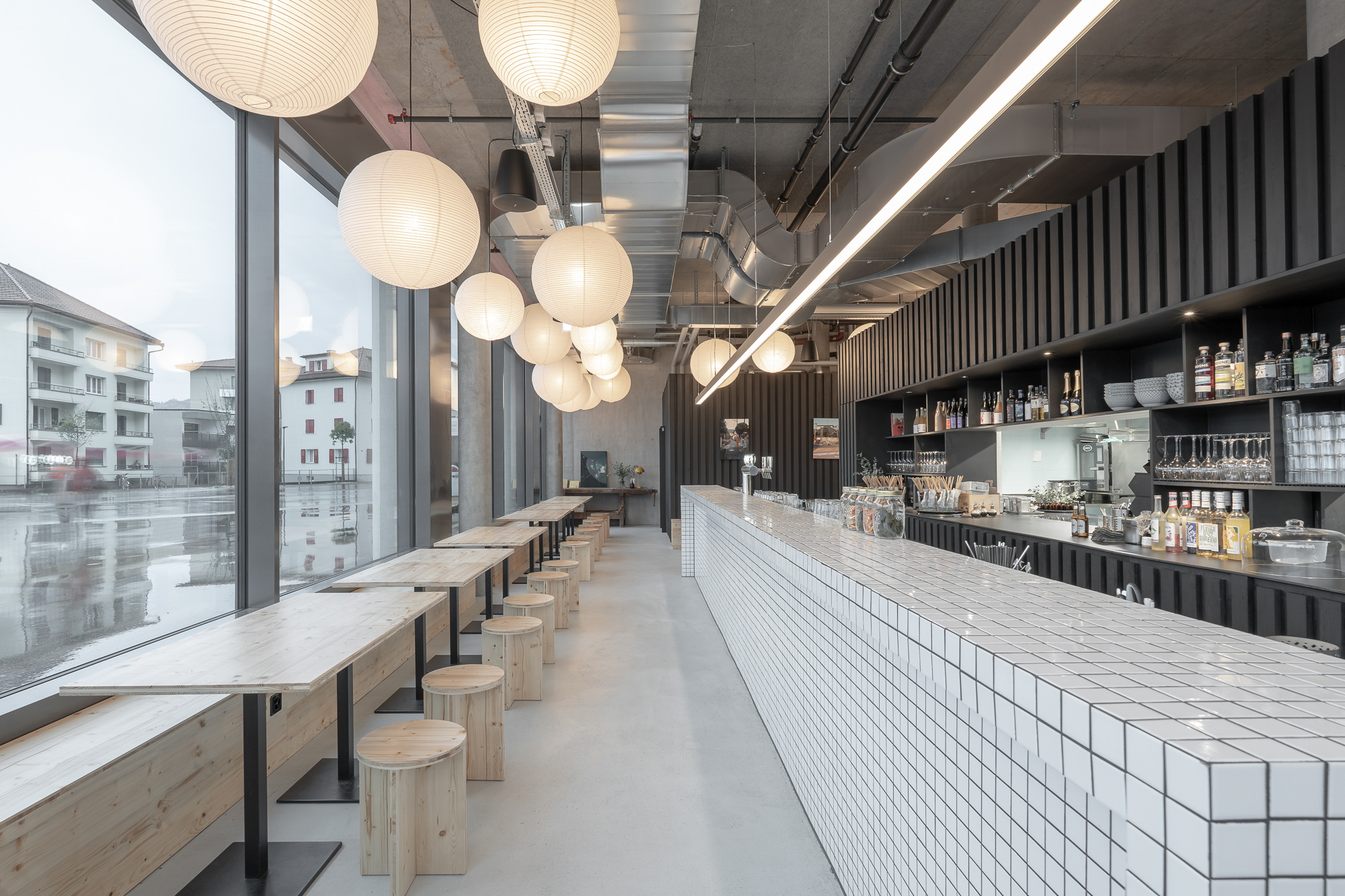 Die besondere Geometrie des Raums erforderte einen einfachen Eingriff. Zwei mit schwarzen Holzlamellen verkleidete Blöcke beherbergen die Küche und den Servicebereich. Diese Anordnung ermöglicht einen Empfangsbereich auf der Platzseite, qualitative Flächen für Tische entlang der Glasscheiben oder in der Passage, die das Restaurant mit der Mall des Einkaufszentrums verbindet. Von aussen betrachtet ist es die Bar, die in Szene gesetzt wird.