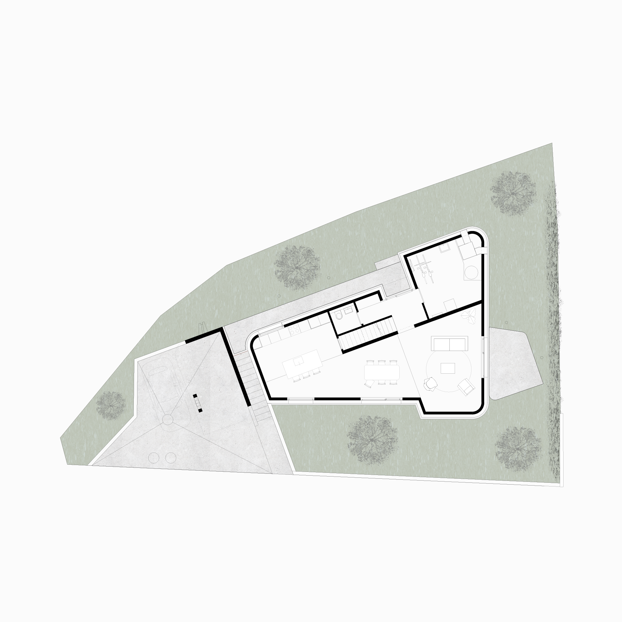 Die erste Herausforderung bestand darin, ein Projekt in einem sehr begrenzten Perimeter zu entwickeln. Die Geometrie des Plans ist das Ergebnis einer Optimierung der bebaubaren Fläche, wobei die Grenzen der Vorschriften eingehalten werden.