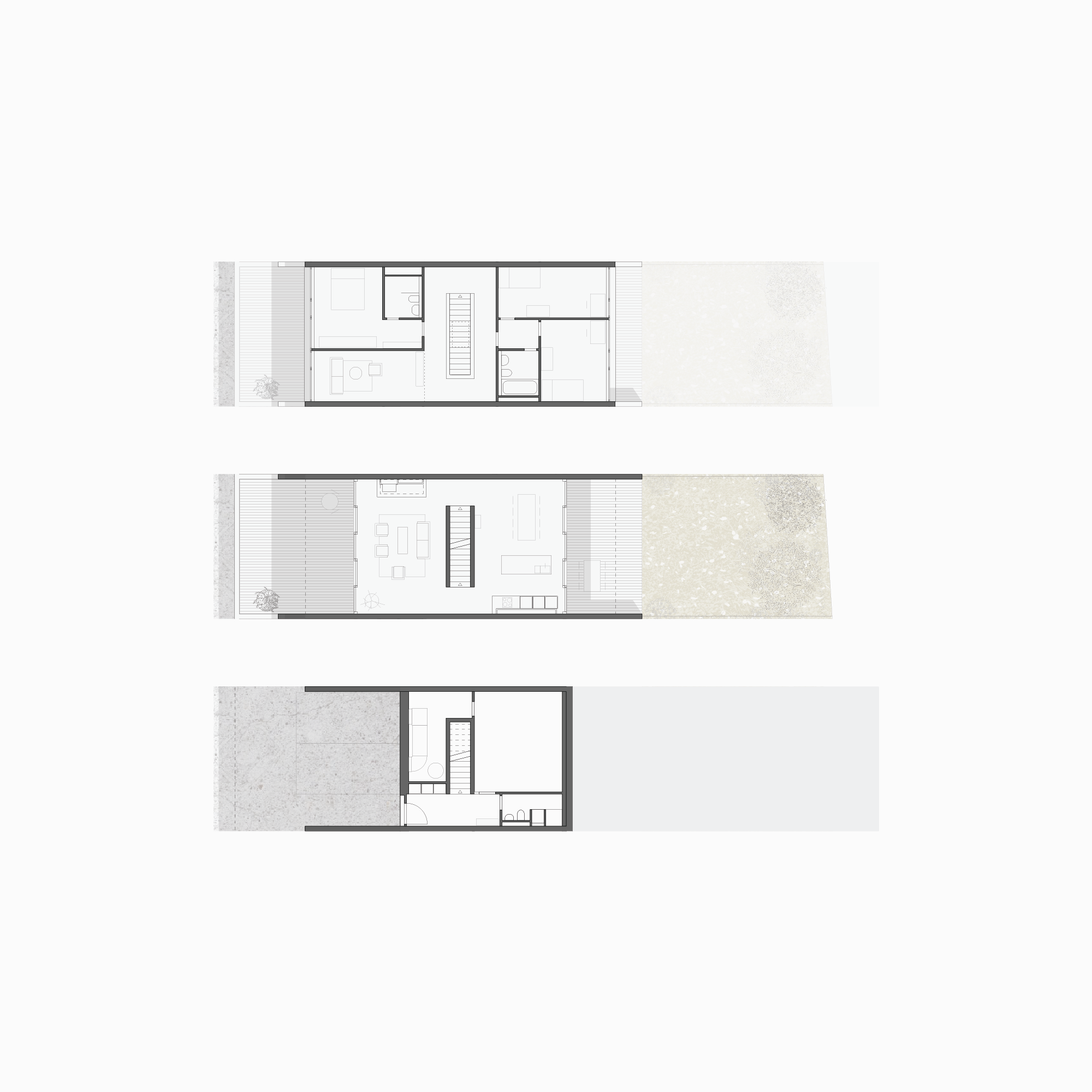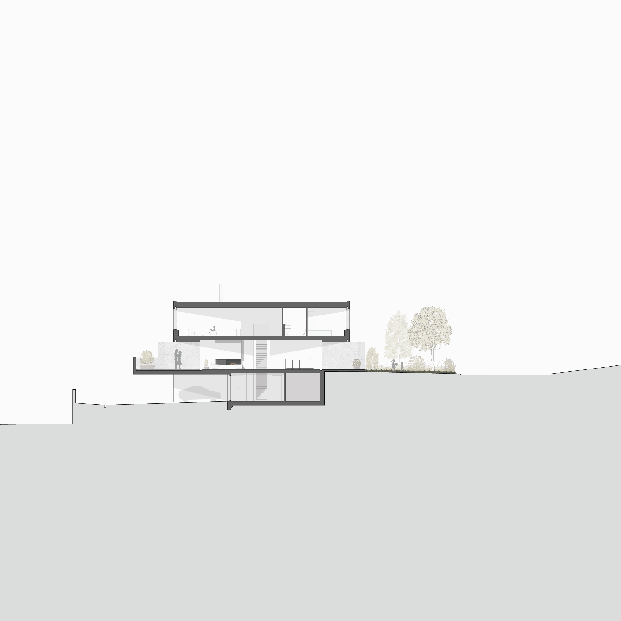 Le niveau du chemin d’accès permet de gérer les entrées et les couverts à voitures. En-dessus, les pièces à vivre bénéficient de l’intimité nécessaire tout en se prolongeant sur les terrasses et les jardins.