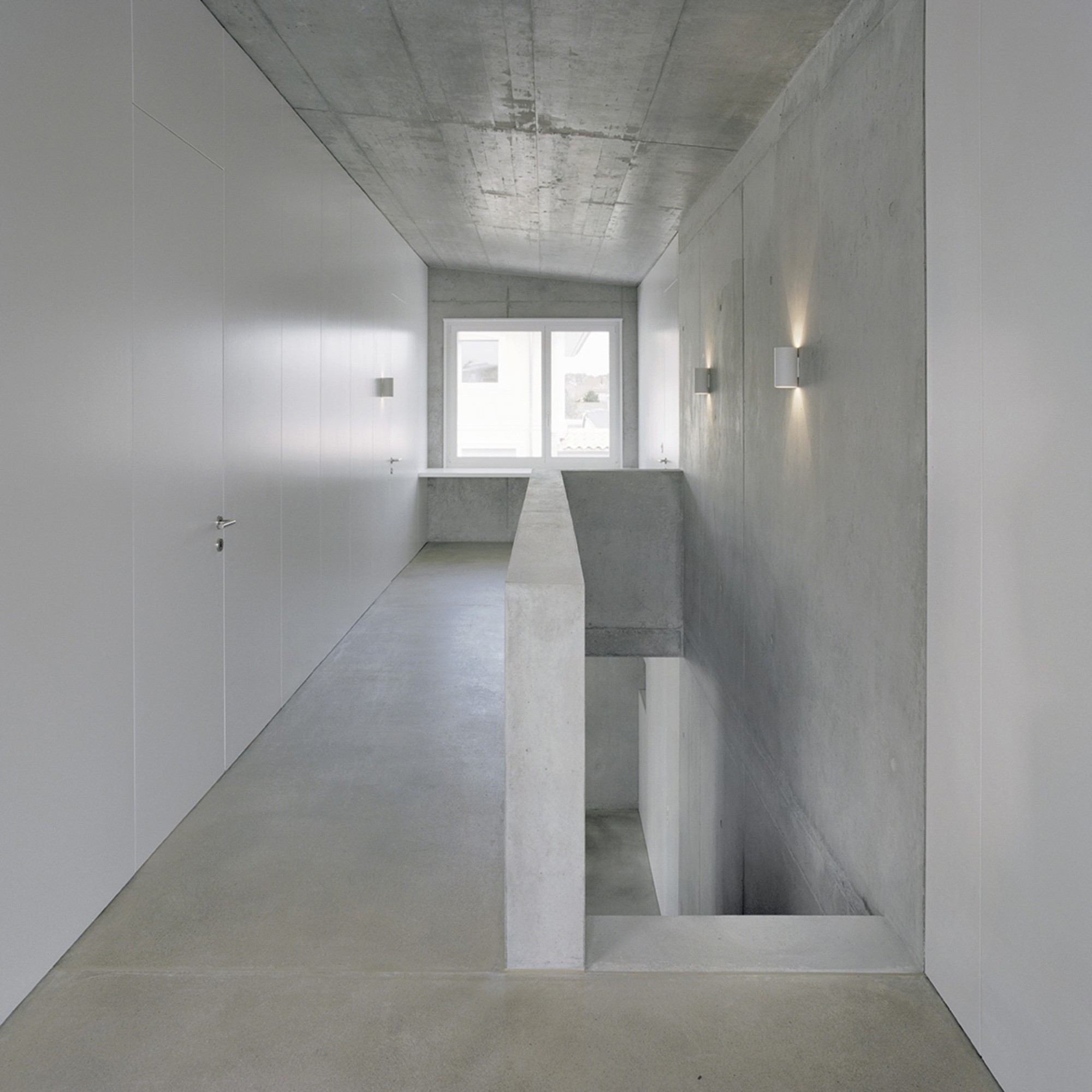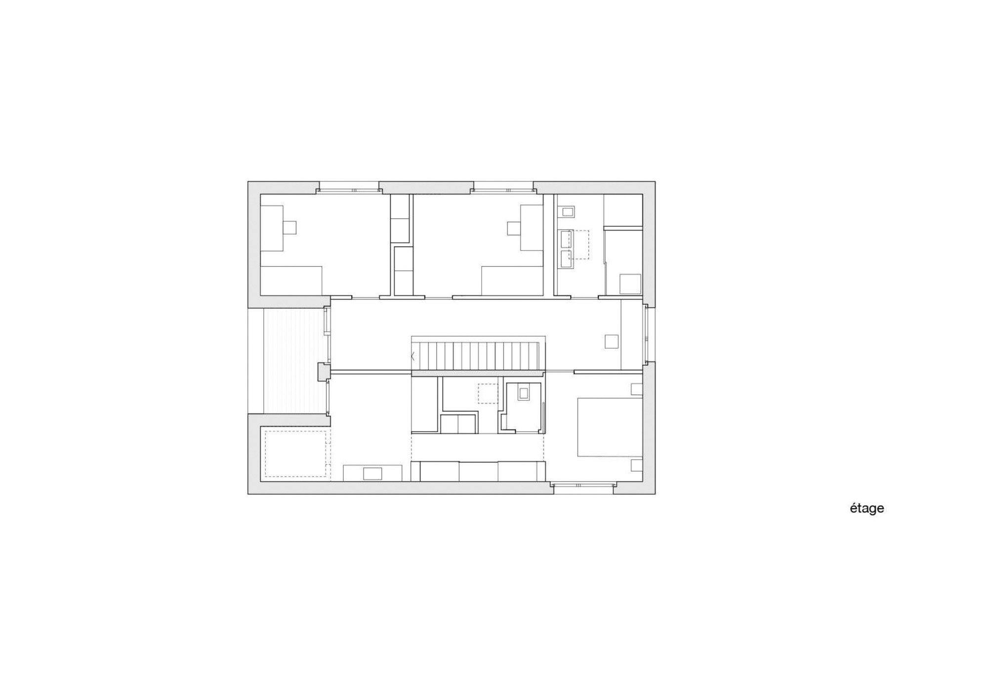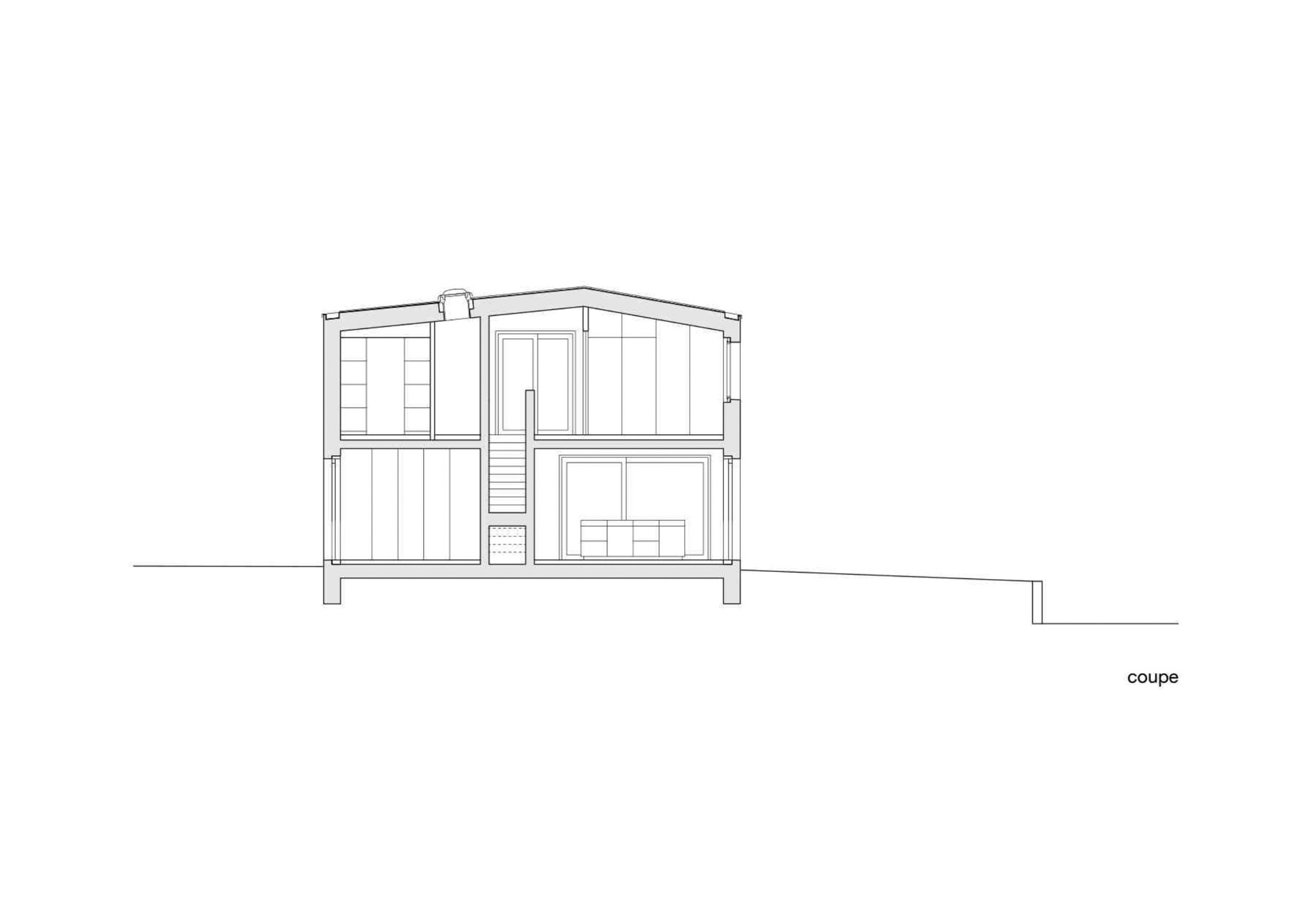 Au rez-de-chaussée, les espaces de vie s’organisent autour de l’élément central qui est l’escalier en béton. A l’étage, la loggia est un prolongement de l’espace de distribution.