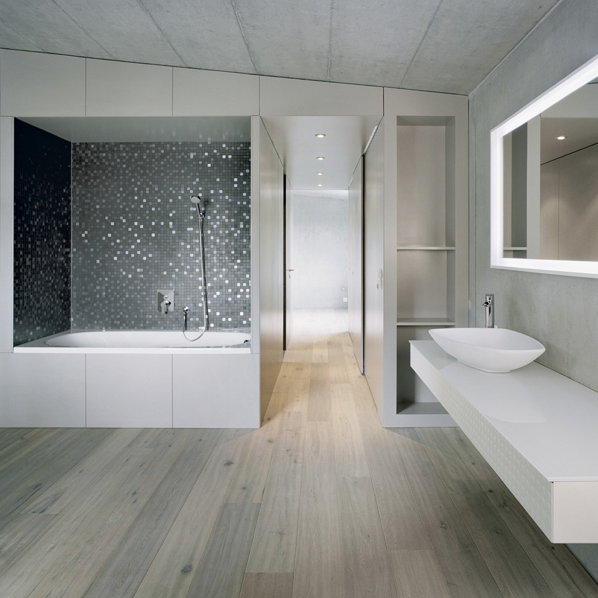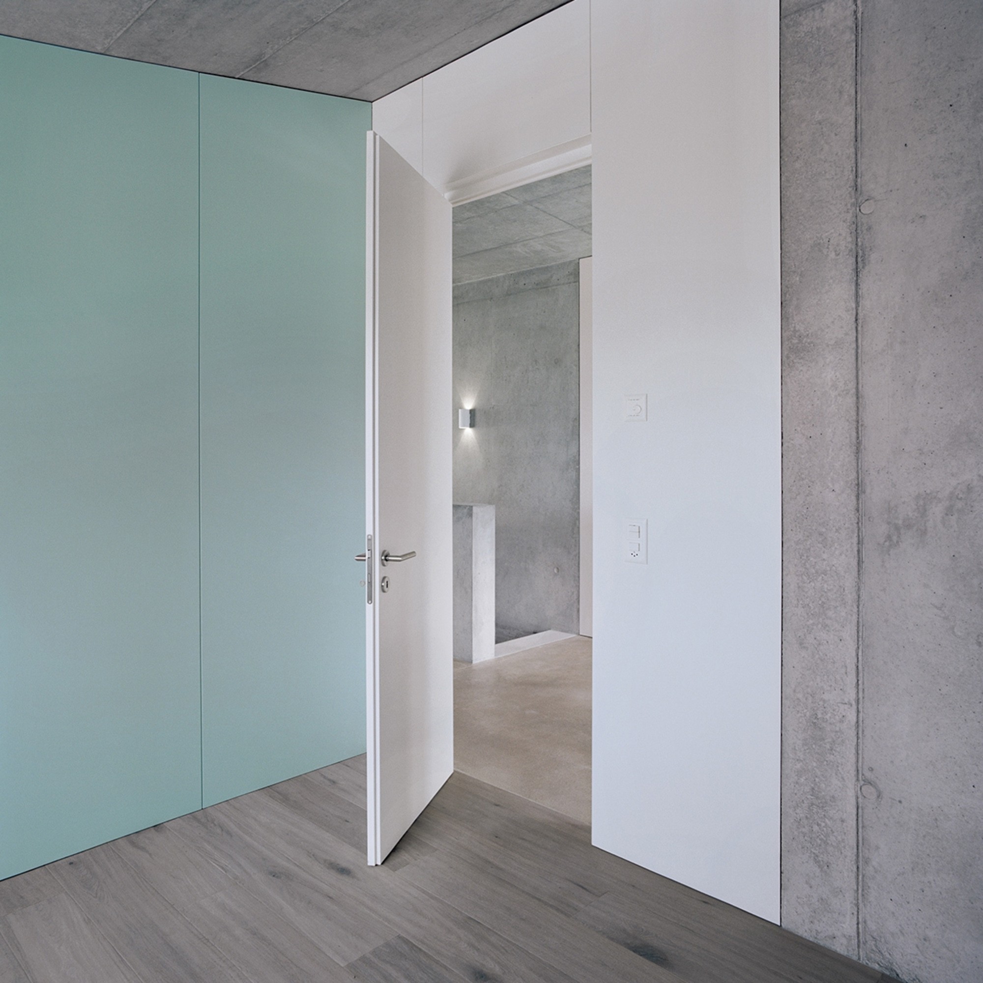 Construite dans un quartier résidentiel, surplombant le lac, la maison est contenue dans un volume bâti modeste. La structure porteuse en béton qui se réduit aux murs de façade et au noyau central de l’escalier est laissée apparente. Les cloisons légères en mdf se teintent ci et là de couleurs.