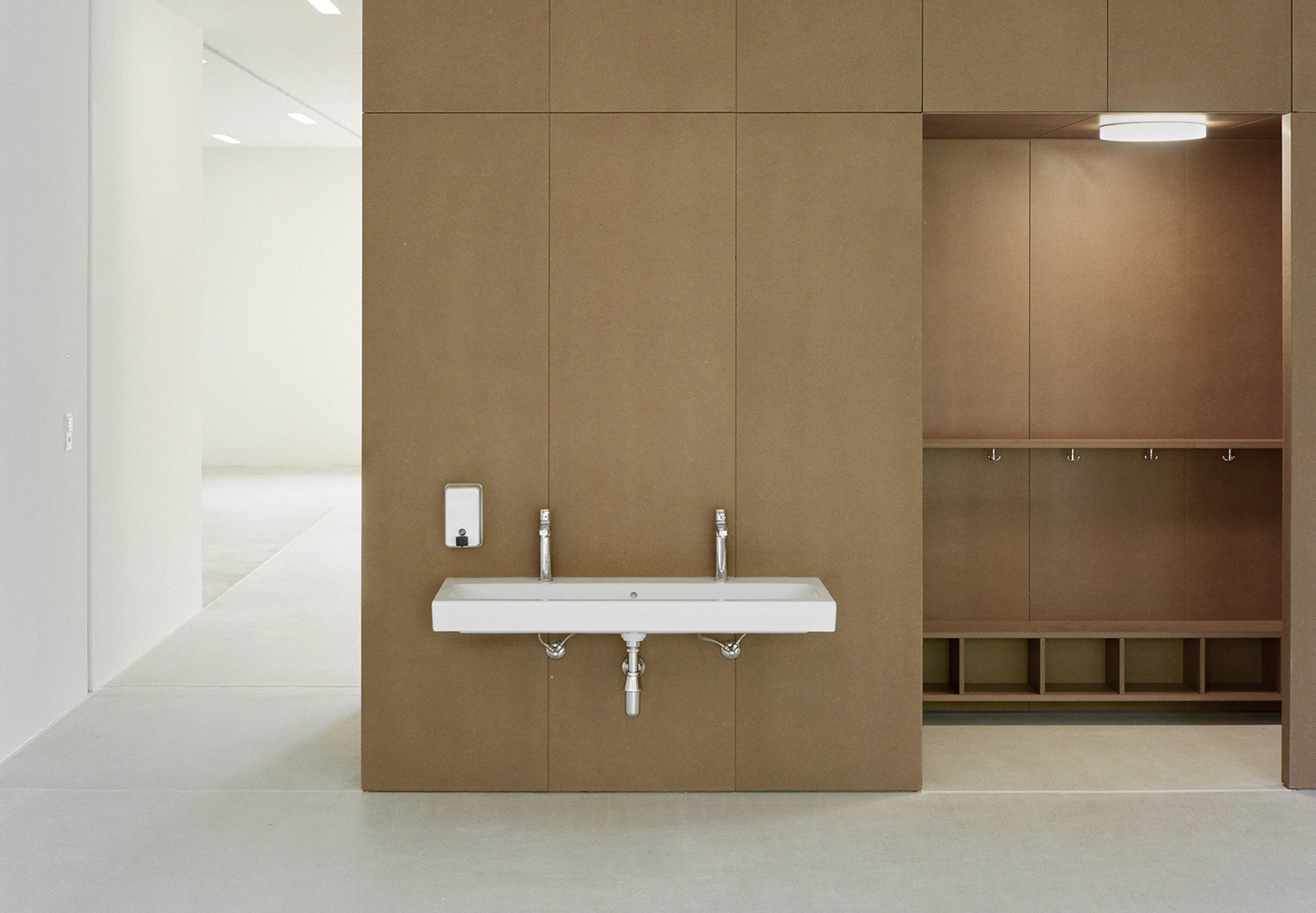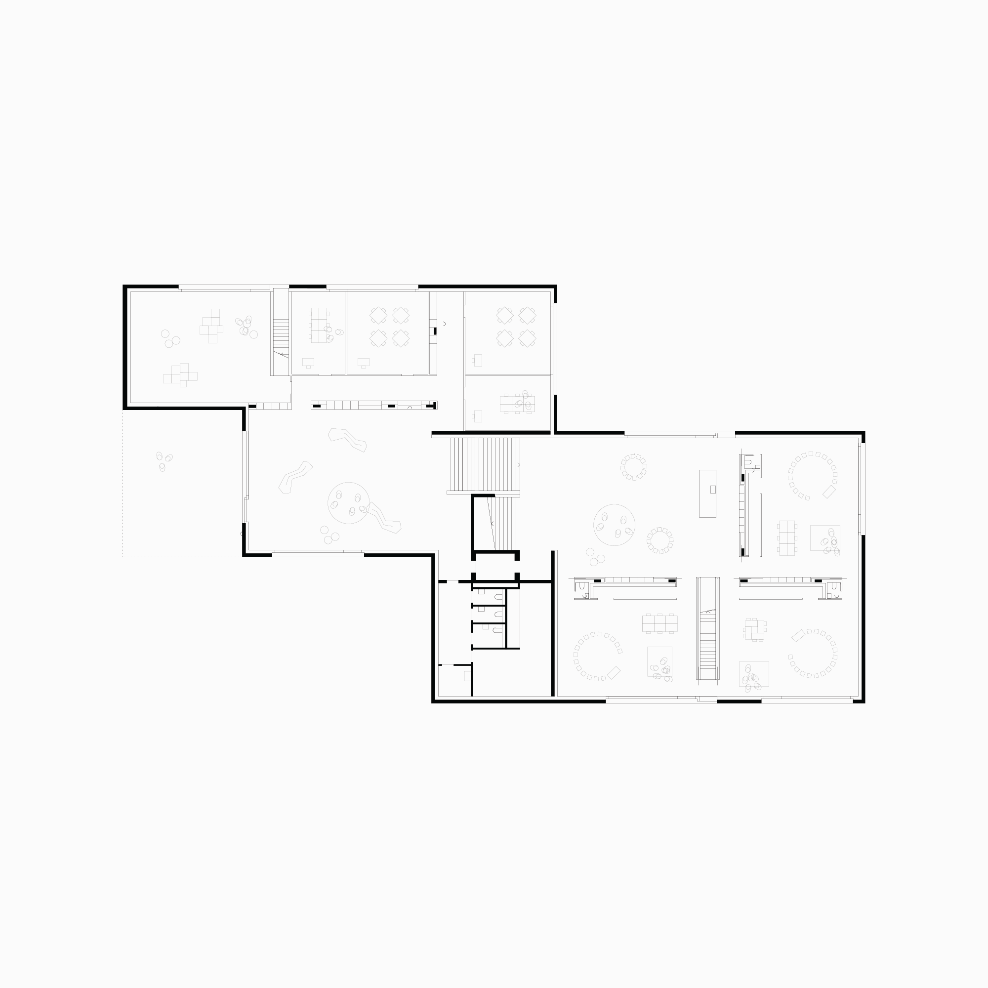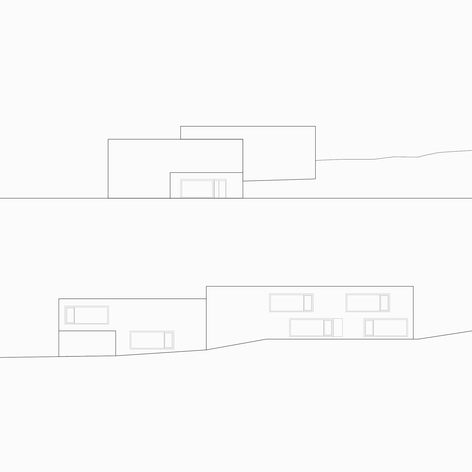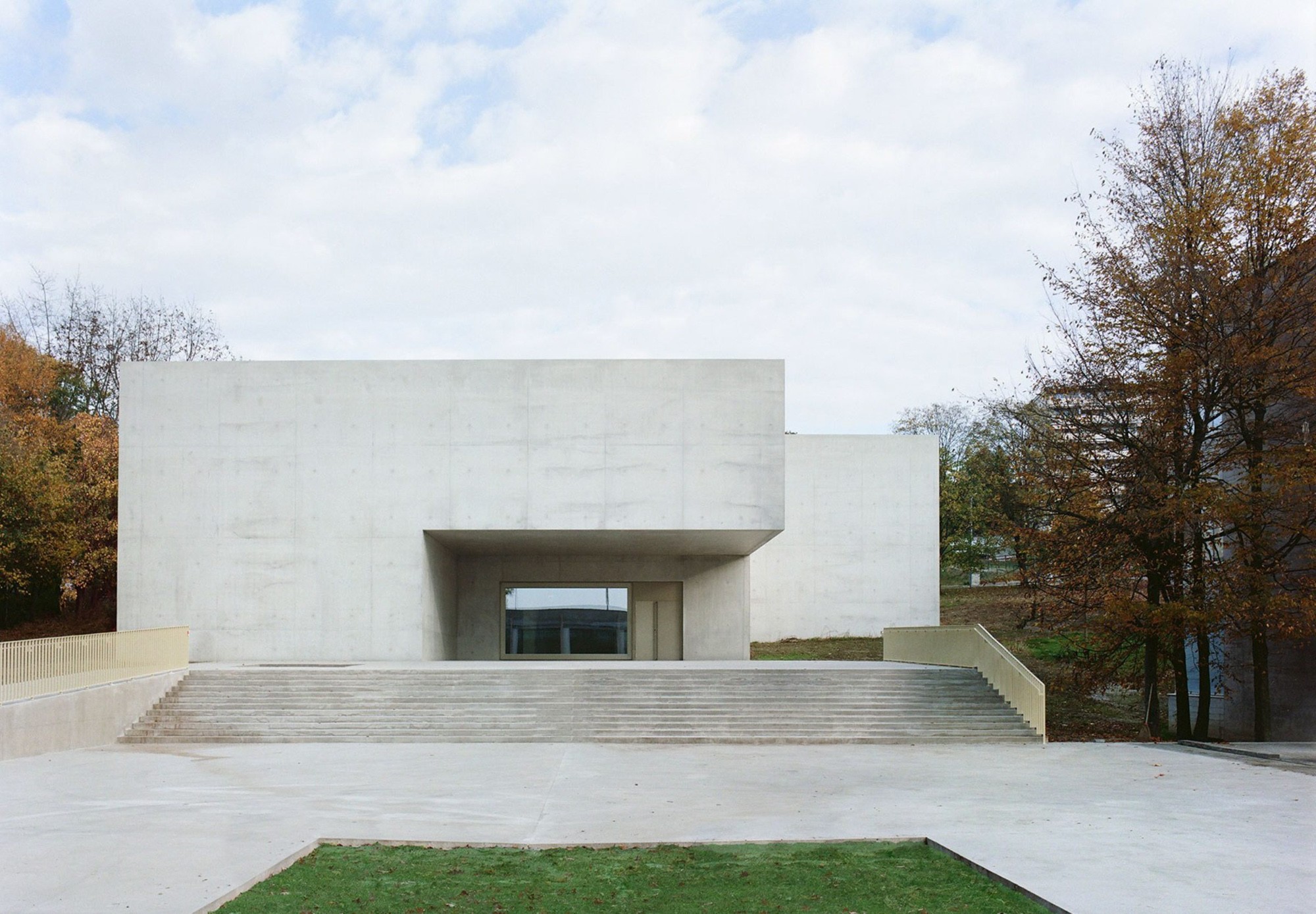 Les deux volumes entremêlés qui composent le bâtiment sont posés sur la pente régulière du terrain. Leur hauteur modeste et leur position décalée verticalement et horizontalement confère à l’objet un caractère sobre, calme et une échelle raisonnable. On retrouve cette sobriété dans la composition des façades où s’alternent des pleins gris clairs et de grandes ouvertures. Le nombre limité des fenêtres, leur proportion large et leur disposition concourent à l’expression calme et rassurante de l’école enfantine.