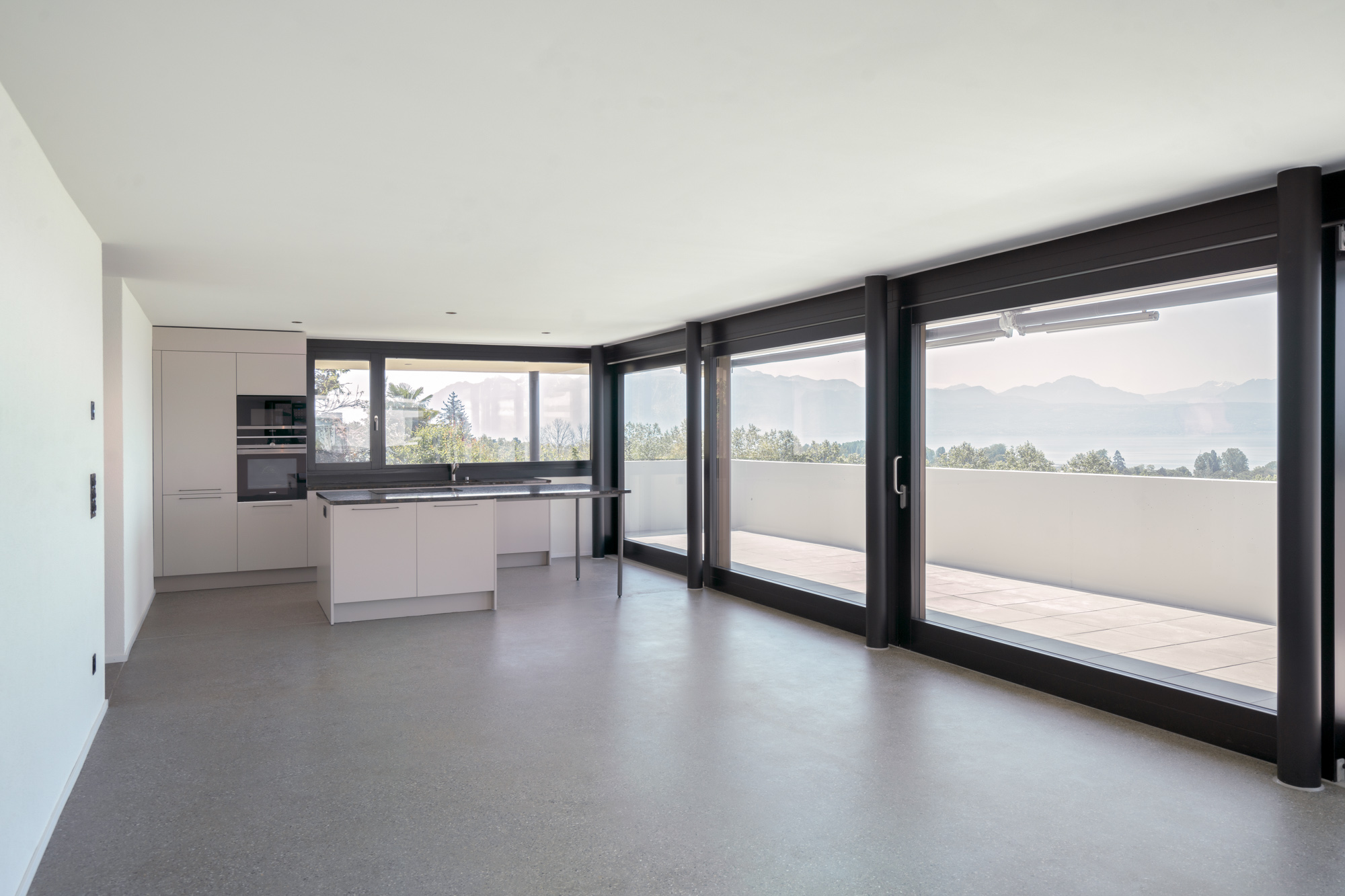 Face au lac et aux Alpes, 3 appartements en terrasses se nichent sur un coteau privilégié. L’implantation ainsi que la volumétrie de ce petit immeuble sont dictés par la topographie exigeante de la parcelle.