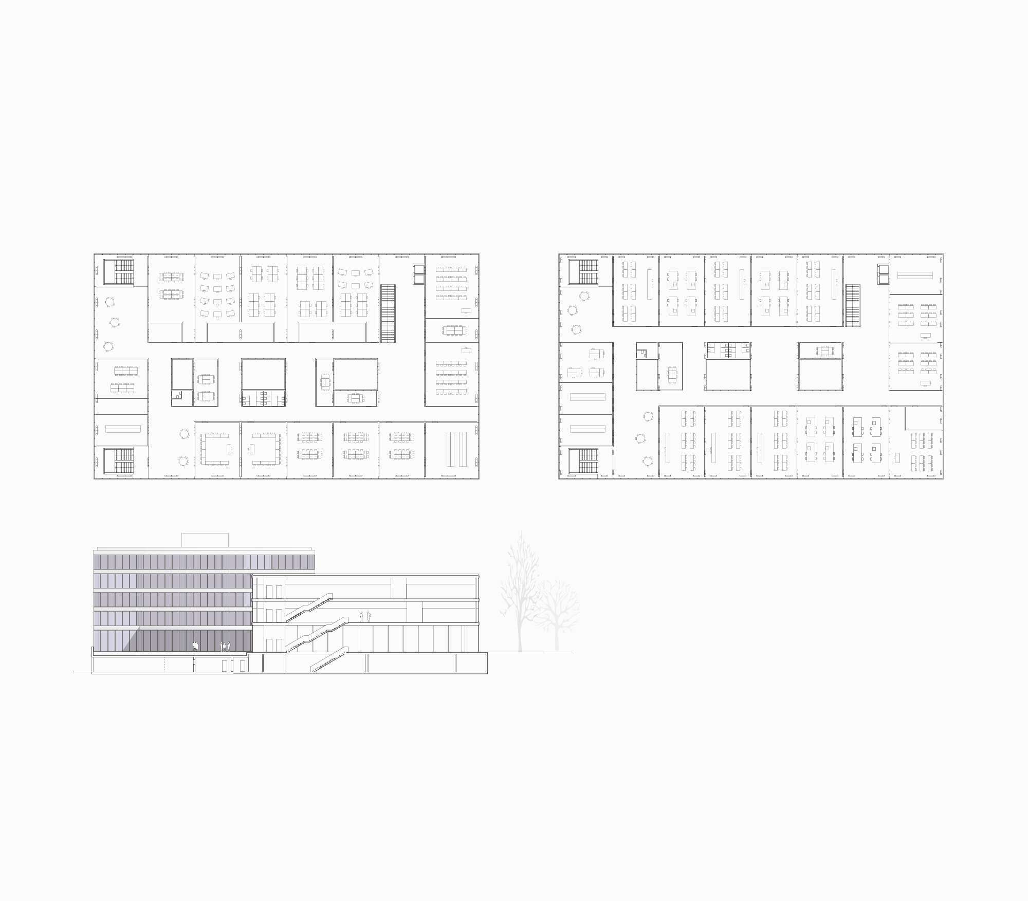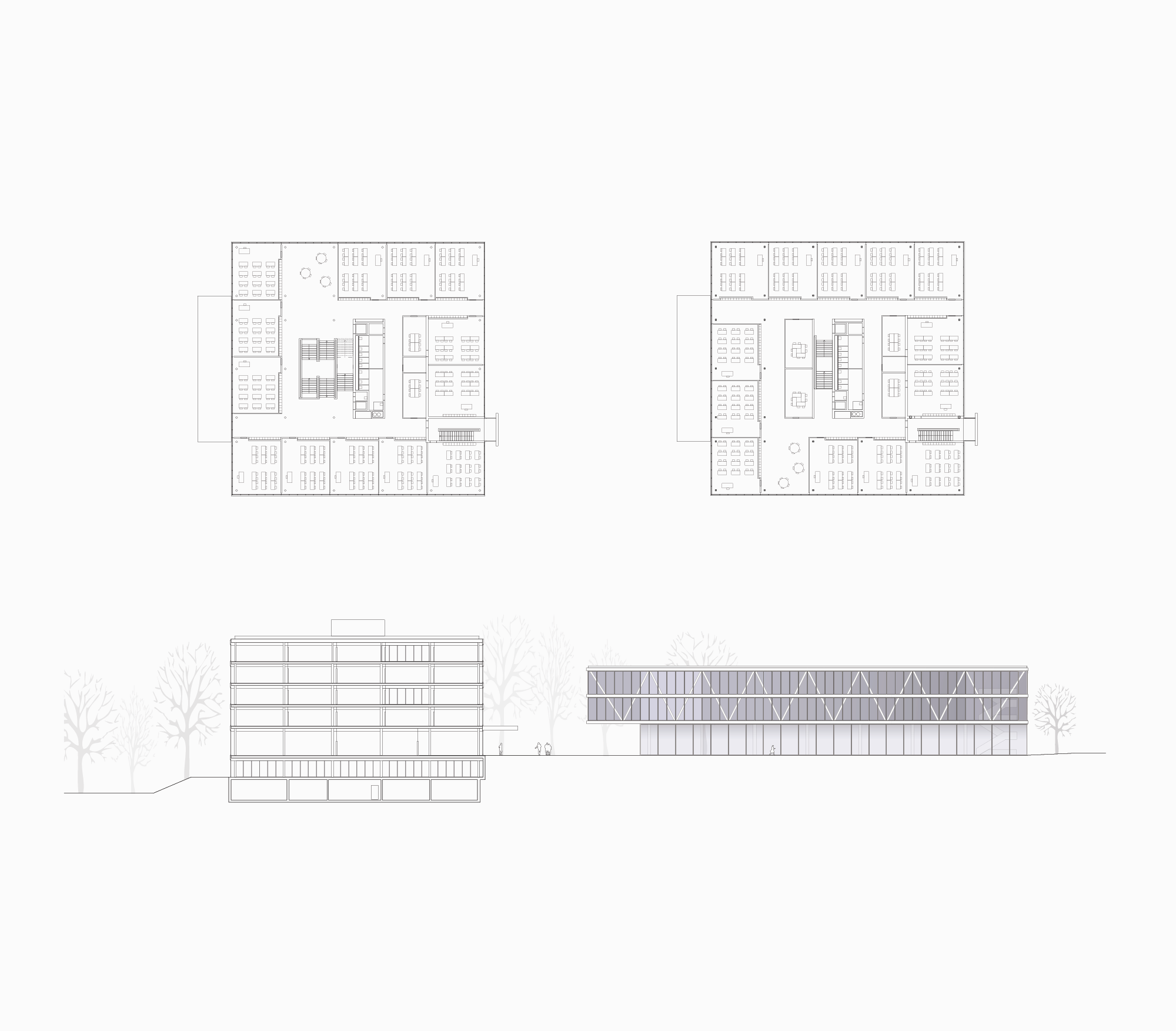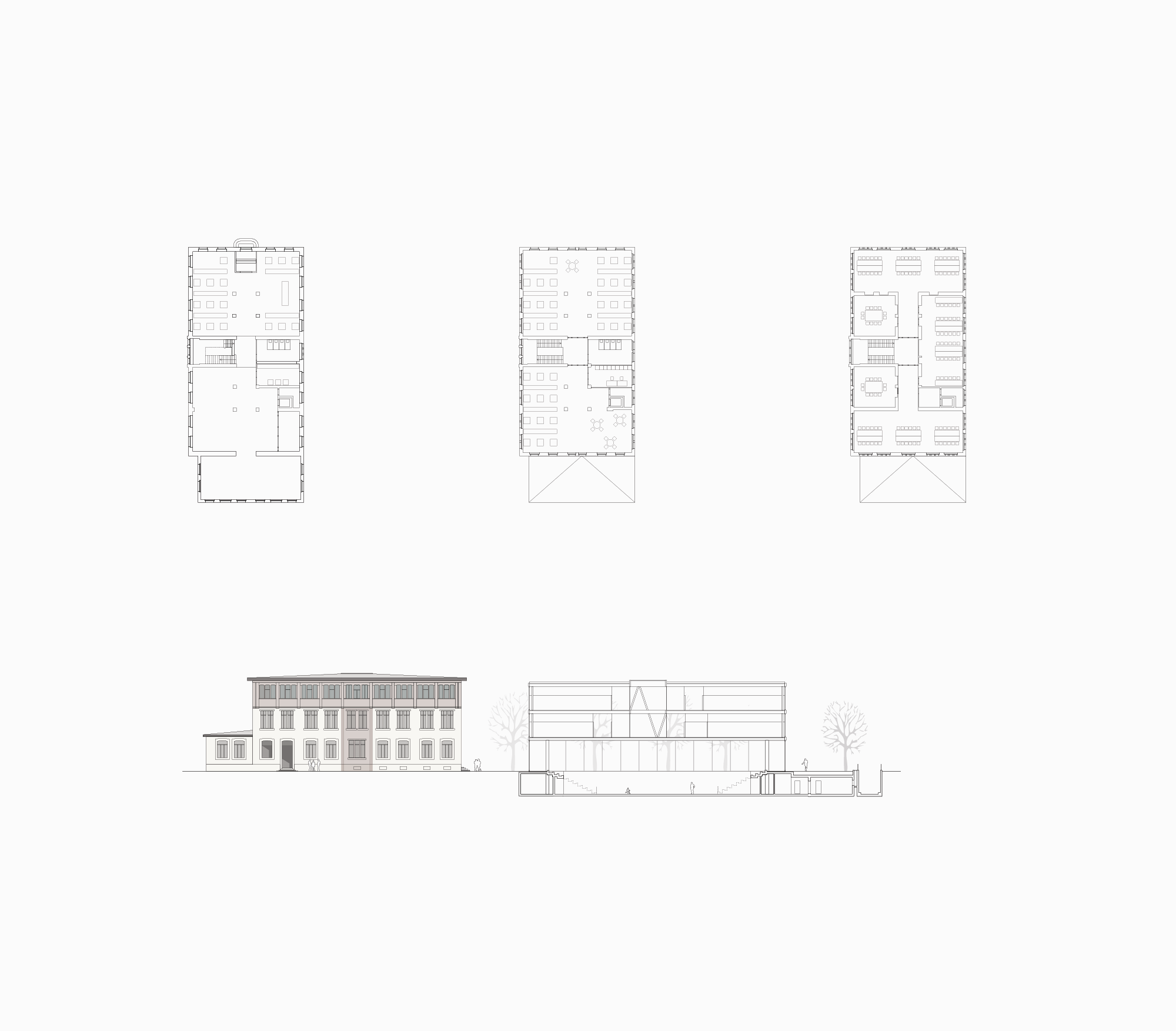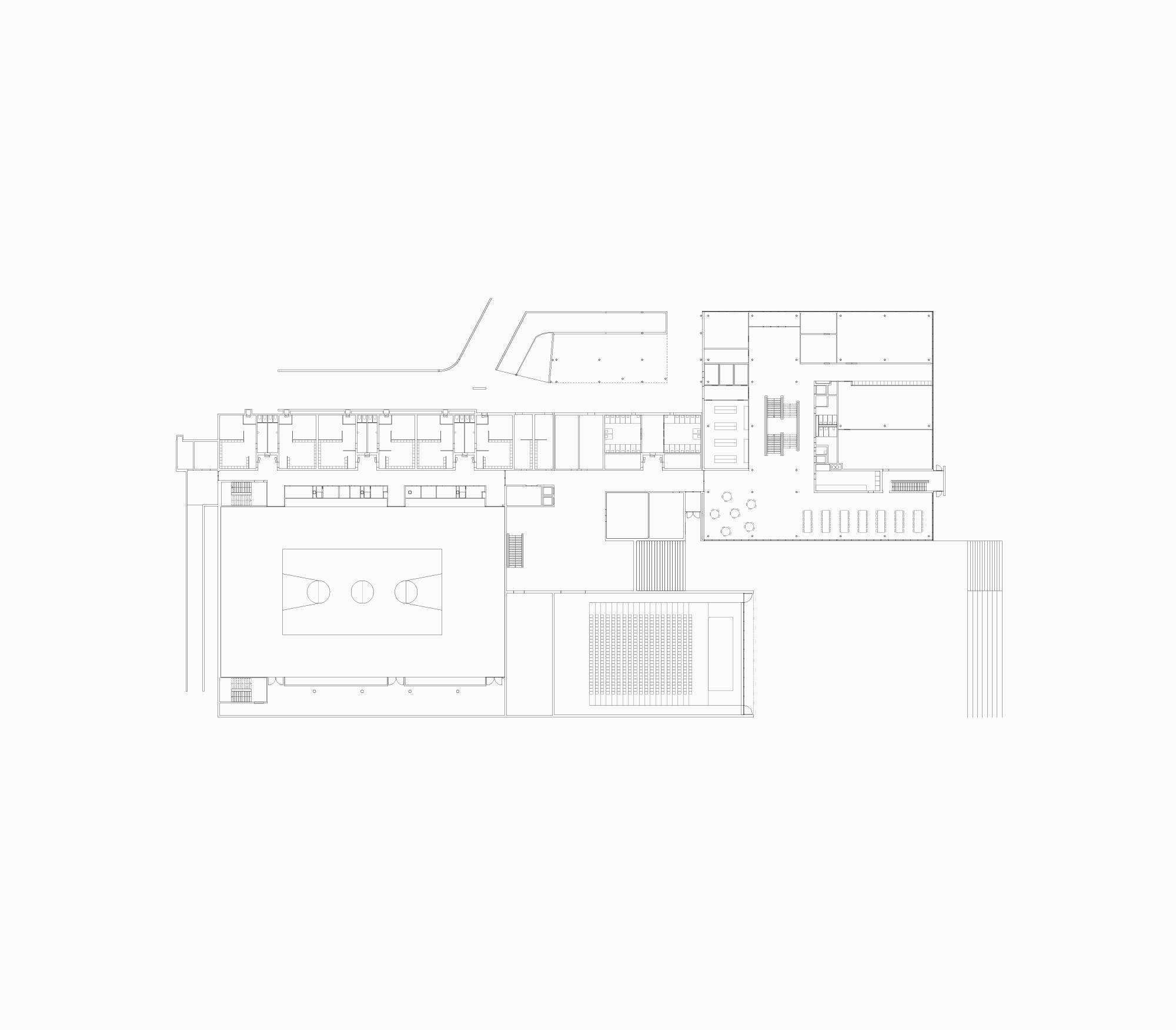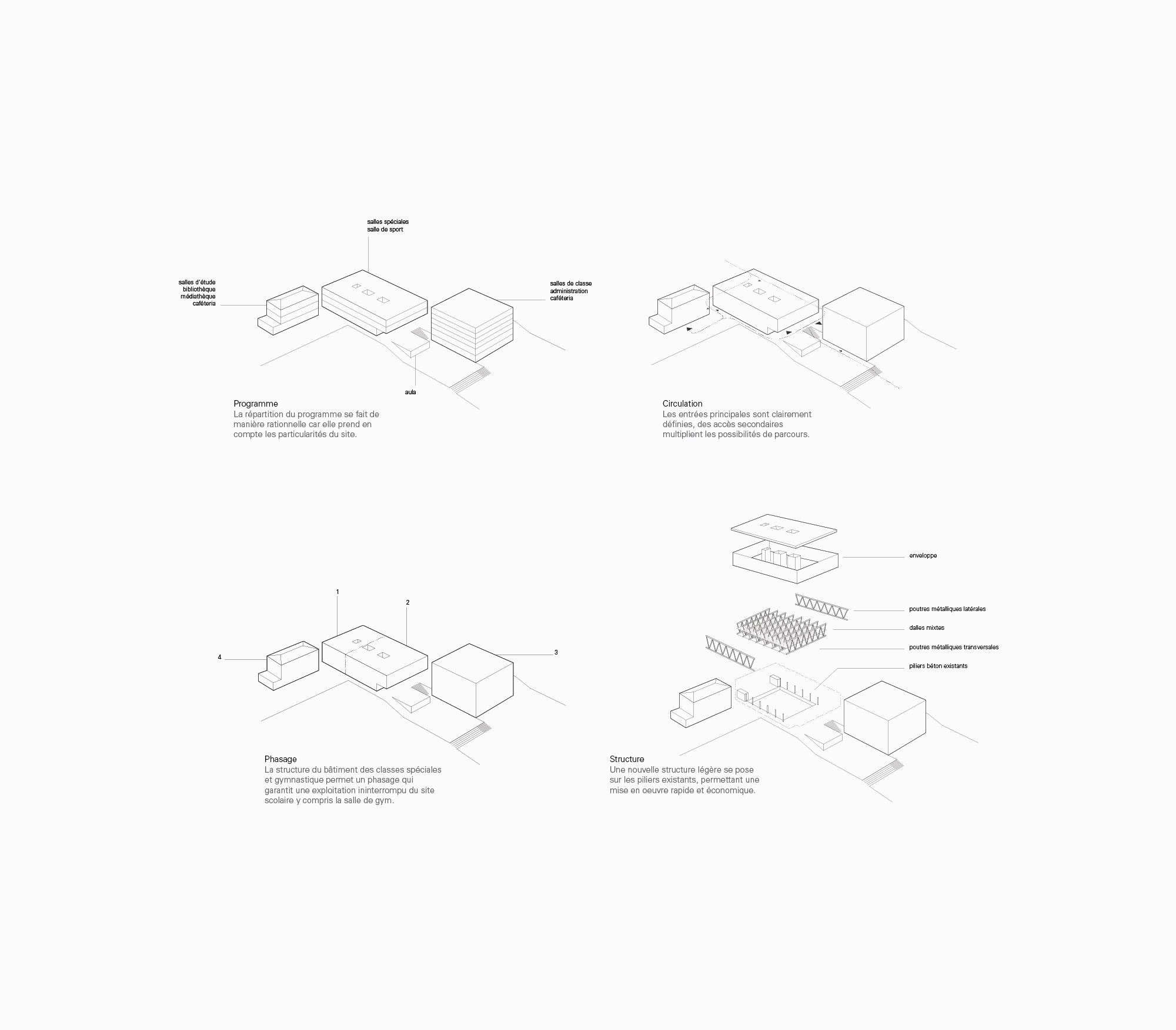 Les accès au site sont redéfinis et, au vu du programme prenant place dans la salle de gymnastique, les relations entre les trois corps de bâtiments sont complétées dans le sens d’une circulation plus efficace et plus dynamique.