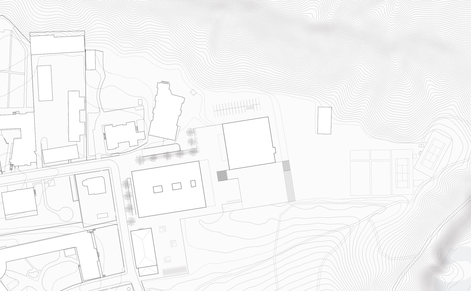 La partie bâtie du site offre une particularité: la salle de gymnastique est très basse et son toit est plat. L’agrandissement du collège y trouve donc naturellement sa place, conservant ainsi la qualité des espaces extérieurs et reconnaissant l’implantation existante en densifiant le bâti.